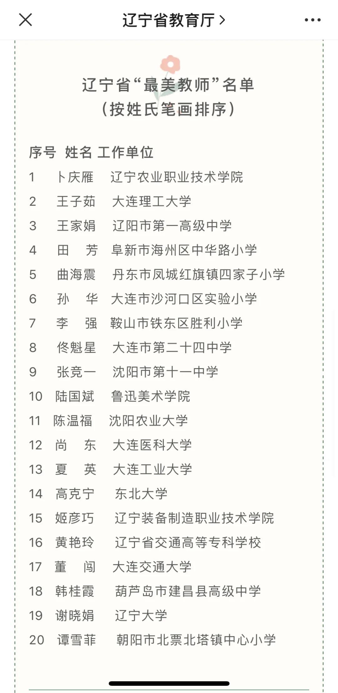 根据《中共辽宁省委宣传部 辽宁省教育厅关于开展“寻找最美教师”活动的通知》,经各市教育局和省内各高等学校推荐、专家评审等程序,全省共有20人入选辽宁省“最美教师”。2021年9月10日,在我国第37个教师节到来之际,省委宣传部、省教育厅公布了辽宁省“最美教师”名单。我校教师姬彦巧同志荣获辽宁省“最美教师”称号。