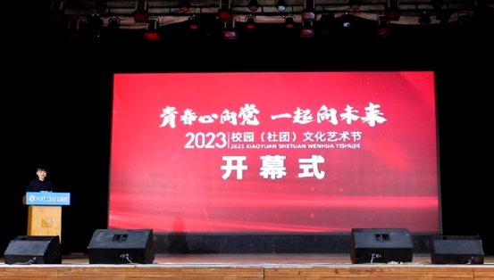 学生工作处处长在开幕式上宣读我校《2023年大学生校园(社团)文化艺术节实施方案》。本届艺术节贯穿全年,面向全校青年学生广泛开展类型多样、内容丰富的文化活动。各学院分团委、学生社团将围绕歌手大赛、舞蹈大赛、朗诵大赛等7项精品项目设计开展文化活动。