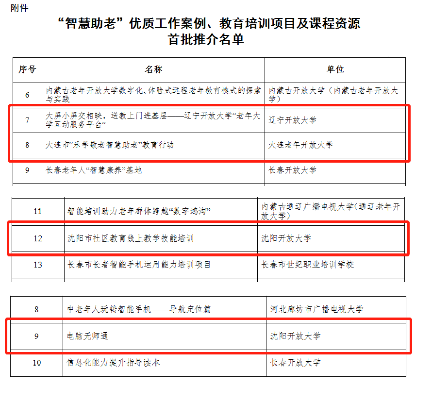 根据教育部《关于组织开展“智慧助老”优质工作案例、教育培训项目及课程资源推介工作的通知》(教职成司函〔2021〕44号)要求,在省教育厅的领导下,经各单位推荐、省社区教育指导中心审核推荐,辽宁开放大学的“大屏小屏交相映,送教上门进基层——辽宁开放大学‘老年大学互动服务平台’”、大连老年开放大学的“大连市‘乐学敬老智慧助老’教育行动”入选首批优质工作案例,沈阳开放大学的“沈阳市社区教育线上教学技能培训”和“电脑无师通”分别入选首批优质教育培训项目和优质课程资源。