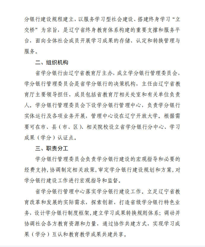 省教育厅是辽宁省学分银行主办单位,成立学分银行管理委员会作为省学分银行的决策机构,对学分银行建设工作给予组织、制度和经费保障;辽宁省学分银行管理委员会下设学分银行管理中心,设在辽宁开放大学(辽宁广播电视大学),负责学分银行实体运行及各项业务开展。