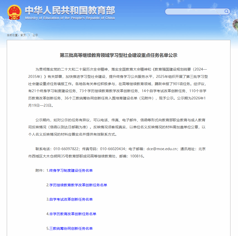 近期,教育部职业教育与成人教育司公示第三批高等继续教育领域学习型社会建设重点任务遴选结果,我校申报的“服务产教融合发展的省域学分银行建设”项目成功入选,标志着我校在终身学习制度创新领域获得教育部认可,实现了省域学分银行建设实践新突破。