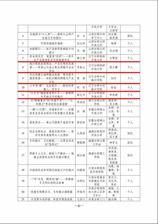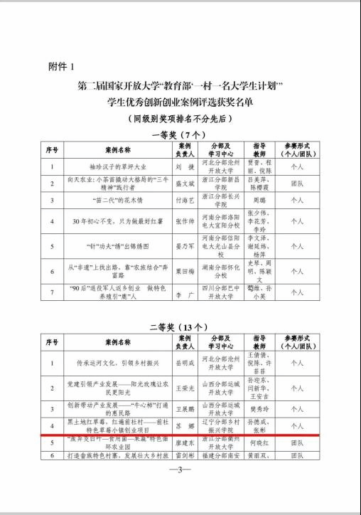 根据《关于开展第二届国家开放大学“教育部‘一村一名大学生计划’” 学生优秀创新创业案例评选活动的通知》要求,我校经过认真筛选和审核,在大量优秀案例作品中,报送9个案例进行评选。经专家评审和公示,由孙德成和张彬老师指导的《黑土地红草莓,红遍前杜村一前杜特色草莓小镇创业项目》喜获二等奖,由古黎丽、陈万鹏、刘洋、赵佳和李凤新老师分别指导的5个项目获得了优秀奖,孙徳成等7名老师获得了优秀指导教师的称号,学校获得优秀组织奖。